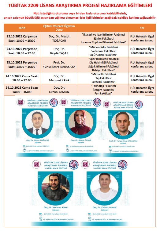 TÜBİTAK 2209 Lisans Araştırma Projeleri hazırlama eğitimlerine tüm öğrencilerimiz davetlidir. Oturum tarihlerine ekli afişten ulaşabilirsiniz.