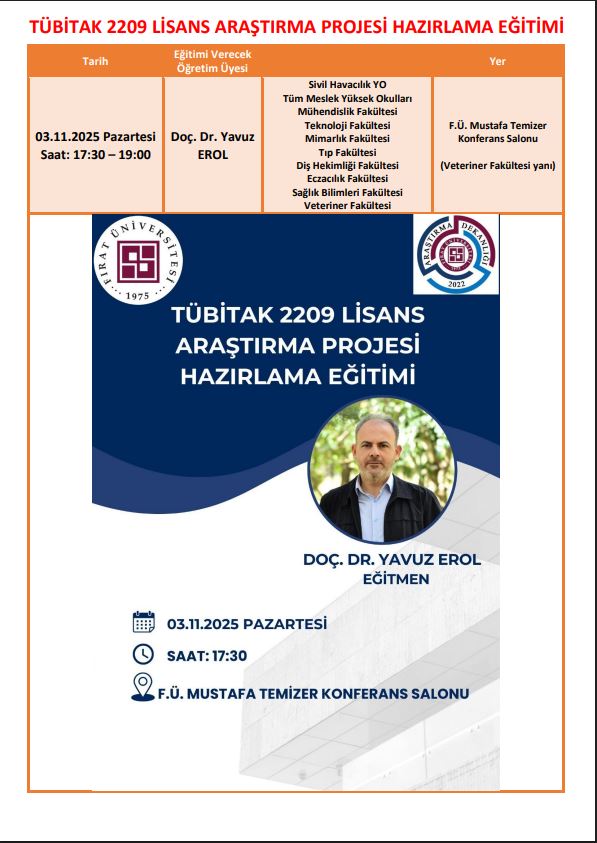 TÜBİTAK 2209 Lisans Araştırma Proje Başvuruları kapsamında düzenlenen eğitimlerin altıncısı ve sonuncusu 03 Kasım 2025 Pazartesi günü saat 17:30’da Mustafa Temizer Konferans Salonu’nda gerçekleştirilecektir. TÜBİTAK 2209 projeleri için Son başvuru tarihi: 12 Kasım 2025 📍 Yer: Mustafa Temizer Konferans Salonu 🕠 Tarih ve Saat: 03 Kasım 2025 – 17:30 Tüm ...