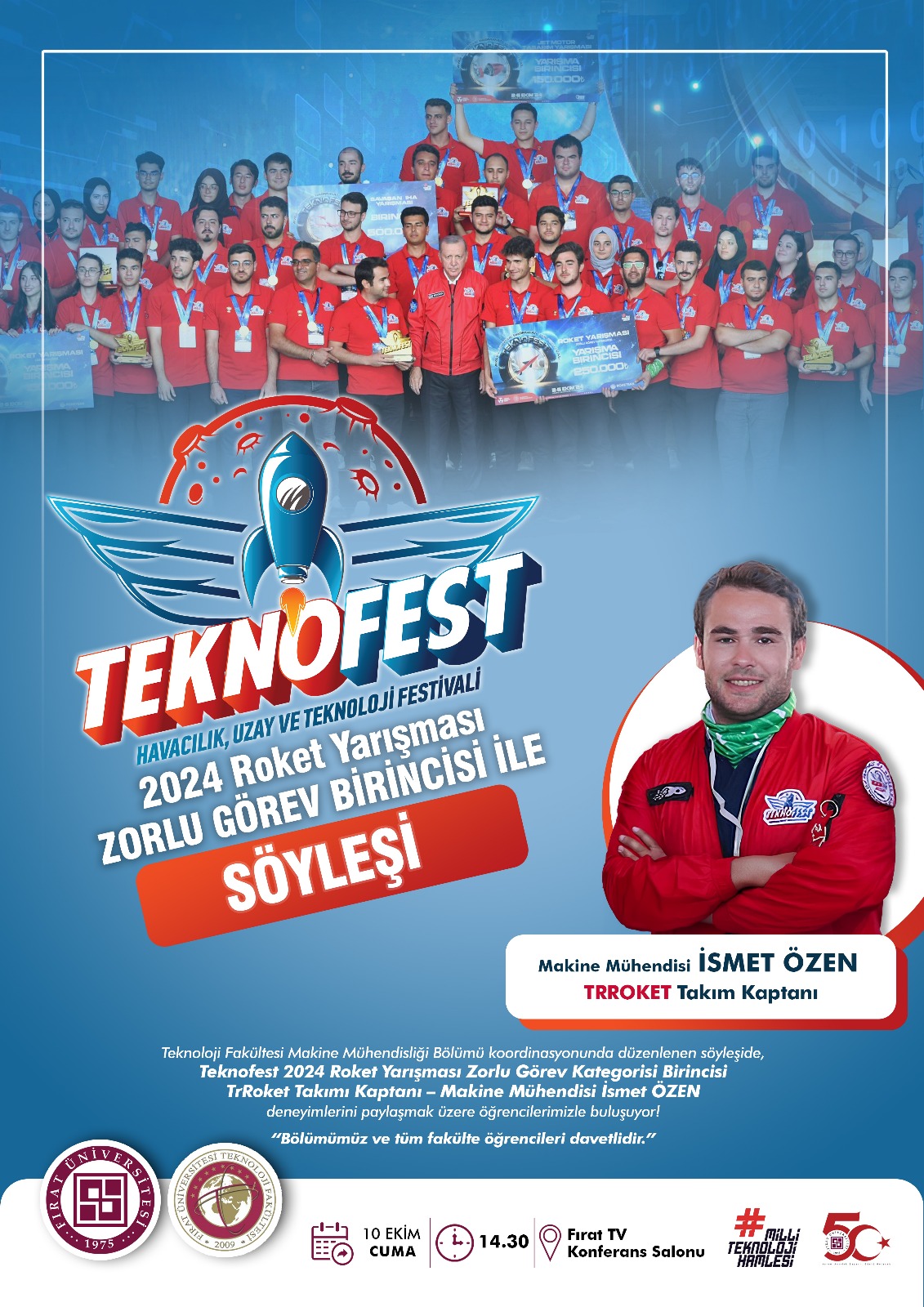 Bölümümüz lisans öğrencilerinin akademik ve mesleki gelişimlerine katkı sağlamak, kalite güvence kültürünün yaygınlaştırılması ve öğrenci başarısının görünür kılınması amacıyla, üniversitemizi temsil eden Teknofest 2024 Roket Yarışması Zorlu Görev kategorisinde birincilik ödülü alan TrRoket Takım kaptanı Makine Mühendisi İsmet ÖZEN’in söyleşisi 10 Ekim Cuma günü 14:30'da Fırat TV konferans salonunda yapılacaktır. Bütün öğrencilerimiz ve öğretim üyelerimiz davetlidir.